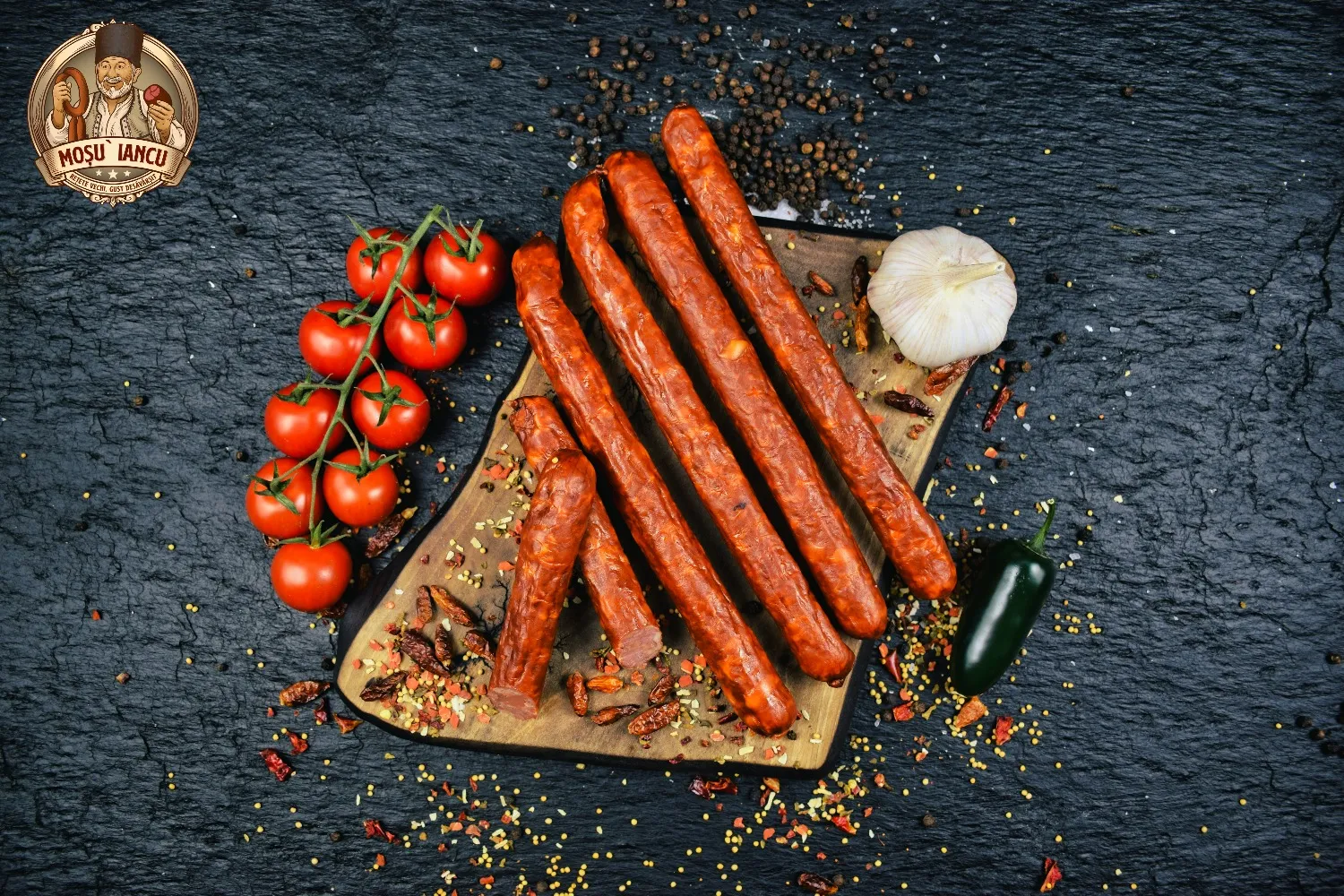 Carnati Cabanos Mosu` Iancu, preparati din carne de porc de calitate, condimentati natural si afumati lent, pentru un gust autentic romanesc.