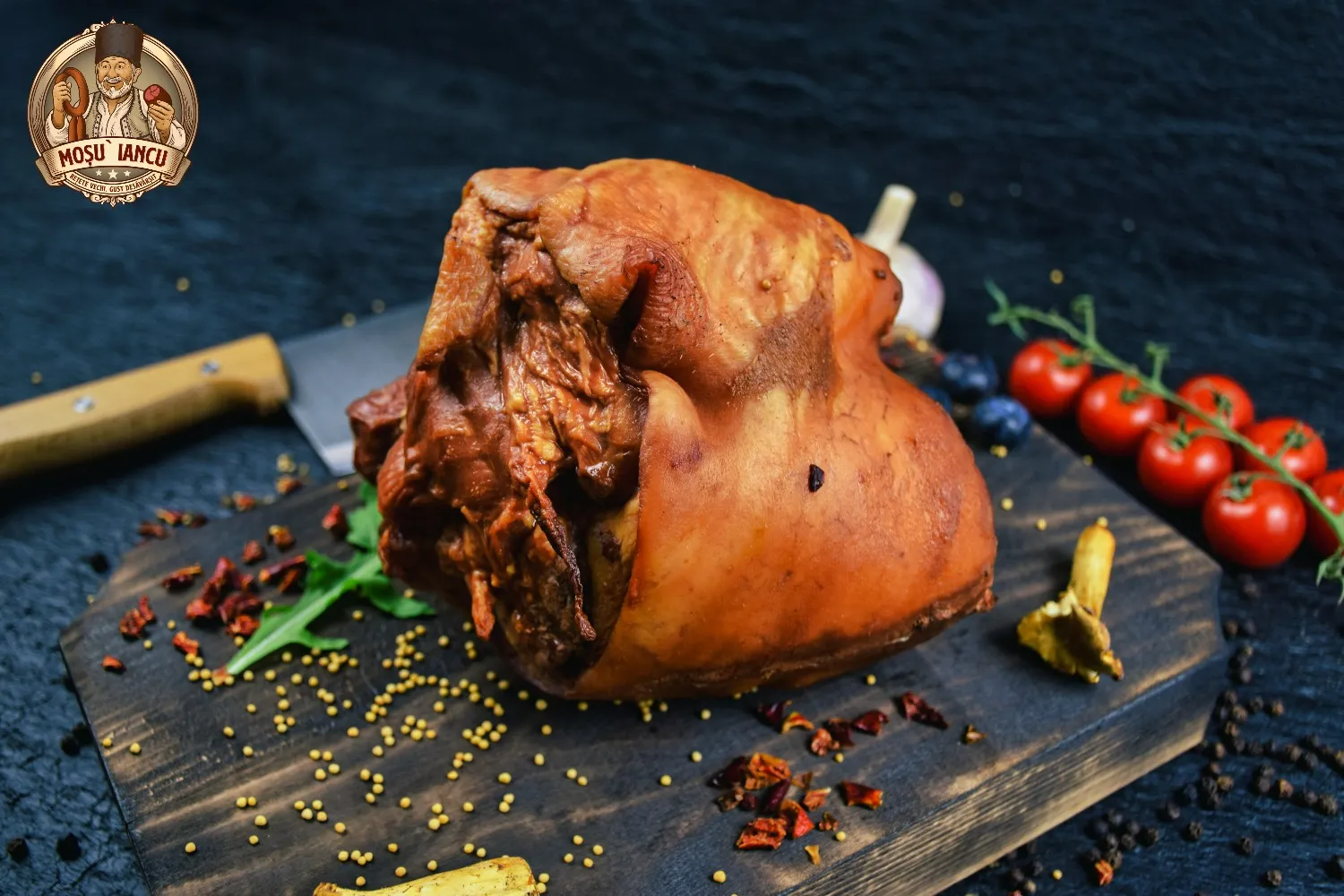 Ciolanul Afumat fara Os Mosu` Iancu este un produs autentic romanesc, creat special pentru cei care apreciaza gustul traditional si retetele vechi pastrate cu grija. Preparat din carne de porc de cea mai buna calitate, atent selectionata si condimentata cu mirodenii naturale, acest ciolan este afumat lent, pe lemn de esenta tare, pentru a oferi aroma intensa si gustul autentic al mezelurilor taranesti.