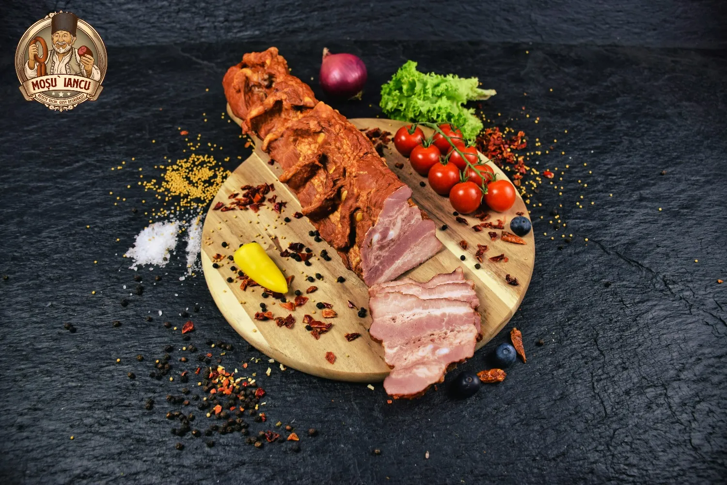 Bacon Mosu` Iancu este un mezel traditional romanesc pregatit dupa retete vechi, pastrate cu grija pentru a oferi un gust desavarsit. Preparat din carne de porc atent selectionata si afumat natural, acest bacon aduce pe masa aroma autentica a bucatariei romanesti. Textura frageda si gustul bogat il fac alegerea ideala atat pentru mesele de zi cu zi, cat si pentru sarbatori sau ocazii speciale. Baconul este versatil, putand fi consumat ca aperitiv, in sandvisuri, omlete sau ca ingredient cheie in mancaruri traditionale romanesti. Retete vechi. Gust desavarsit.