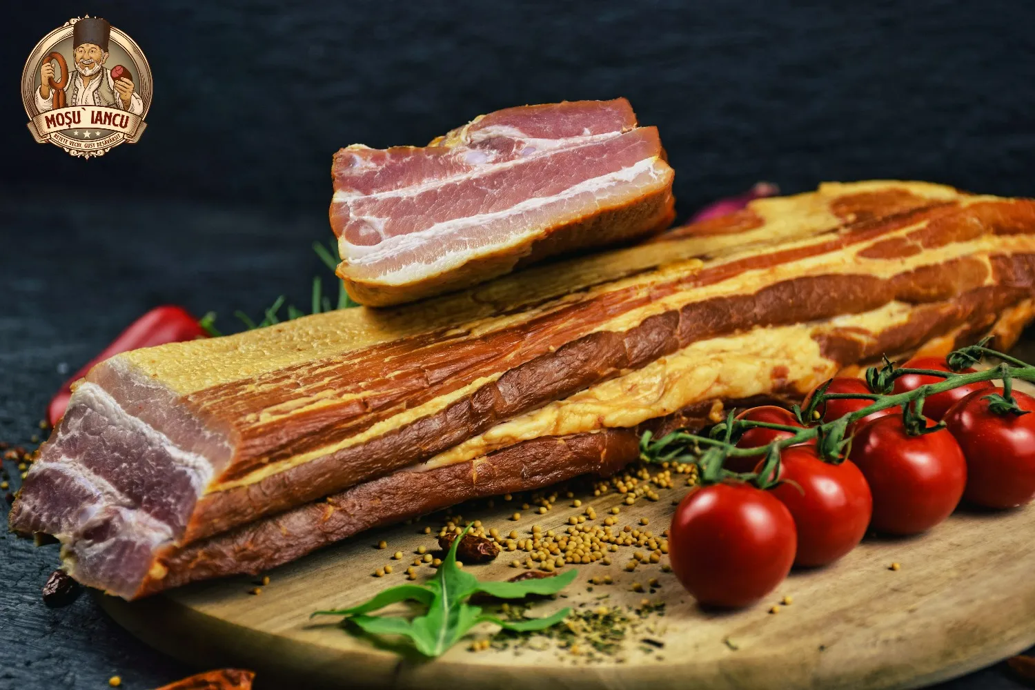 Bacon romanesc afumat natural, preparat din carne de porc de calitate, cu gust autentic si textura frageda.